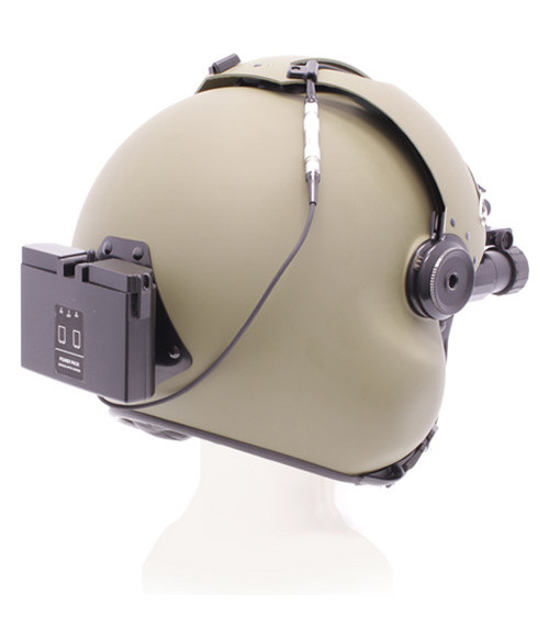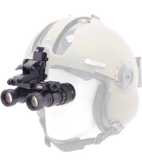 This binocular allows aviators to navigate in low light conditions during takeoff, landing, and performing other tasks that are otherwise difficult in low light conditions. The binocular is compatible with aviator and other helmets with compatible mounting plates. The mounting system allows a wide range of motion to permit comfortable wearing. The battery compartment cap, diopter ring, and focusing ring are knurled to ensure comfortable slip-free adjustments even when wearing gloves. Also included are a padded soft carry case, a helmet mount, a lanyard, four AA batteries, two battery cartridges, a battery pack, objective and ocular lens covers, lens tissue, a screwdriver, and a counterweight.