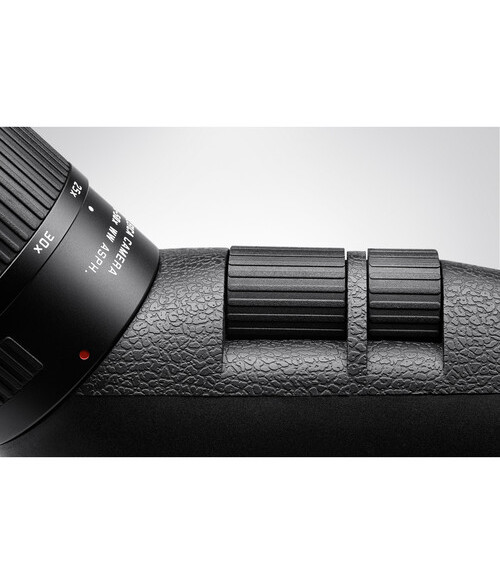 A magnesium-alloy chassis makes the structure of the APO-Televid as rigid and durable as aluminum-chassis designs in the same class but significantly less heavy than those models. To deliver weatherproof performance, the optical channel is nitrogen filled and O-ring sealed, maintaining its watertight seal to a depth of 5 meters. The AquaDura-coated hydrophobic objective lens surface resists moisture accumulation by causing rain and condensation to bead up and roll off the lens surface. The rubber-armored body is shock absorbent and slip resistant, providing an additional layer of protection against the unexpected. Leica's proprietary internal dual-focusing system enables you to control the focus of your scope with coarse or fine movements, ideal for digiscoping and nature observation. The integrated rotating tripod collar, quick-change bayonet eyepiece mount, and sliding lens hood make the APO-Televid a full-featured spotting scope for a wide range of recreational and professional glassing applications.