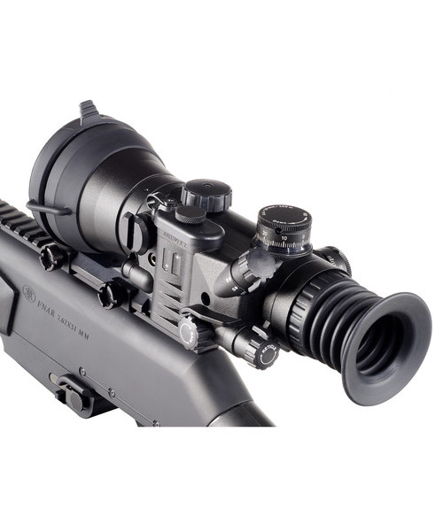 The optical system offers high-definition multi-coated lenses that deliver improved detail, resolution, image clarity, and brightness. The 100mm f/1.5 objective lens offers a wide aperture for collecting more light at night, enhancing visibility. Enable operation in total darkness by providing additional illumination for your targets when using this night vision device with an optional infrared illuminator. To help you get a precision shot, this night vision optic is equipped with a red-yellow mil-dot reticle with adjustable brightness.